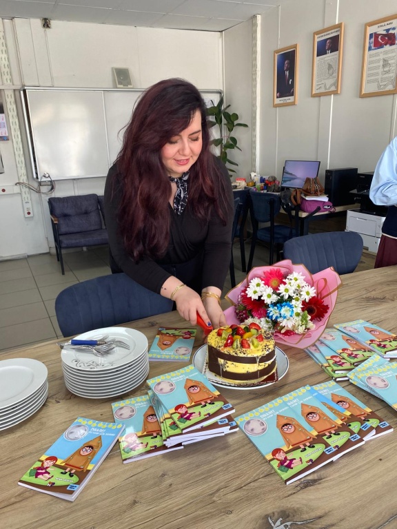 İmza gününün sonunda öğretmenimize çiçek takdim edildi ve bu özel gün, pasta kesilerek kutlandı. Katılımcılar, Seher Erdoğan’ın başarısını alkışlarla ve iyi dileklerle kutlarken, etkinlik boyunca duygulu anlar da yaşandı.